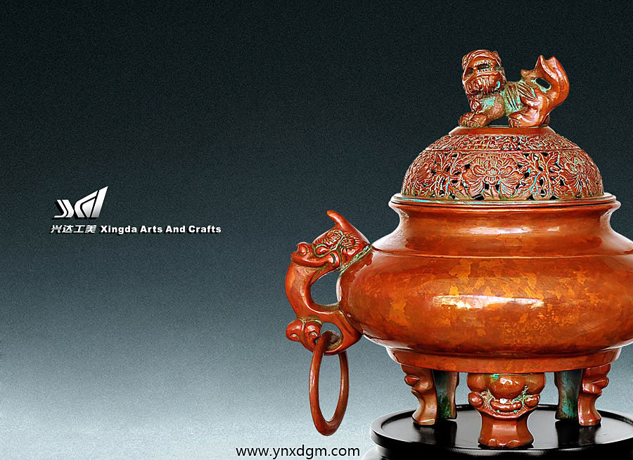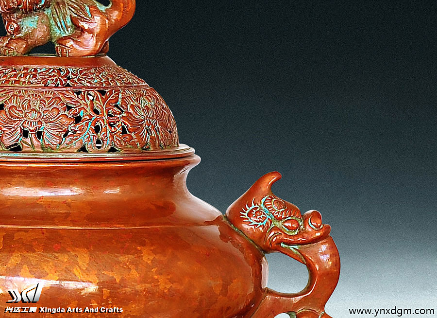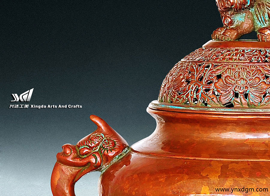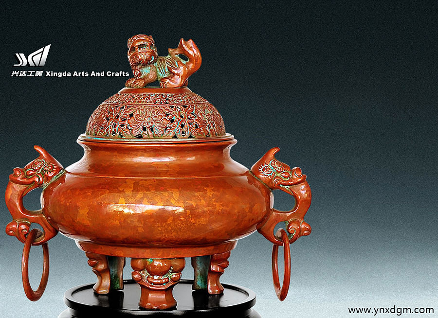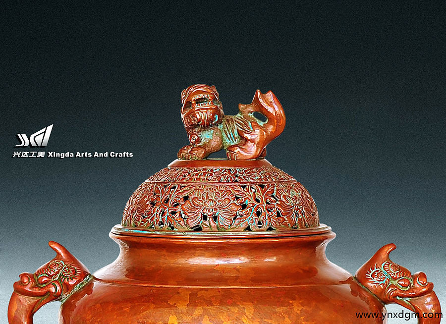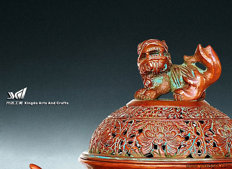 整个造型雍容华贵,炉身为素面的扁圆形,耳脚顶均用兽形装饰,盖则采用富贵牡丹图案装饰,使器形与纹样相互影响,相互衬托,该件工艺品1986年被征为工艺美术珍品,收藏于中国工艺美术馆。